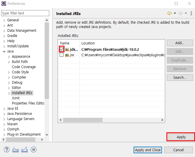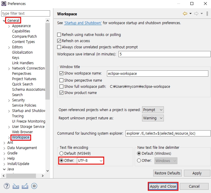 jdk 체크 - Apply and Close 2. 한글 파일이 깨져서 나오는 경우가 있기 때문에 인코딩 설정을 변경해준다.