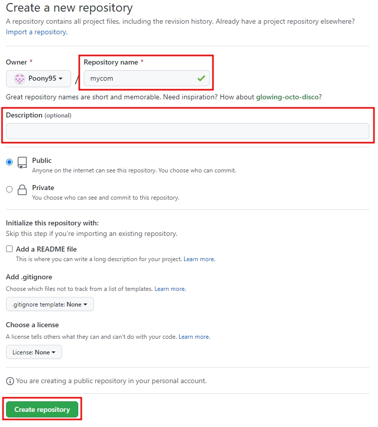 3. Repository name을 자유롭게 정하여 만들고 Create 한다.