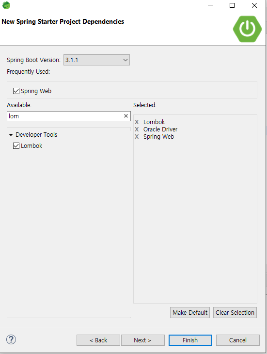 Spring Web : 스프링 기반의 웹 애플리케이션을 개발하는 데에 필요한 라이브러리들이 자동으로 설정Lombok : 어노테이션을 제공, 이를 기반으로 코드를 컴파일과정에서 생성해 주는 방식으로 동작하는 라이브러리