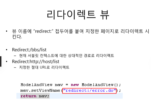 - ModelAndView 클래스 불러와서 사용 (리다이렉트 뷰 값을 설정)