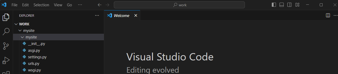(myenv) C:\work>cd mysite7. visual studio code 에서 work 폴더를 열어 확인합니다.